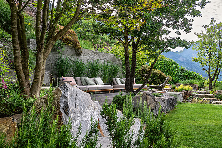 Es ist eine reduzierte Gestaltung, die mit der Topografie verschmilzt und das Panorama nicht stört, sondern rahmt – als Fortsetzung der Landschaft. Nichts lenkt ab vom Ort, der Weite, der Ruhe. Die Reduktion auf das Wesentliche hat nicht nur gestalterische Gründe, denn in dieser Höhe und steilen Lage klappte der Transport der Materialien nur per Helikopter, wobei die Fluglogistik so effizient organisiert wurde, dass kein einziger Leerflug entstand. Selbst die großen Natursteine mussten via Luftweg angeliefert und gesetzt werden – eine Aufgabe, die viel Erfahrung und Gespür erfordert: «Ich analysierte die Form der Felsblöcke am Boden, bestimmte ihre spätere Lage und grub die Mulden so vor, dass die Steine exakt ins Gelände passten und präzise ausgerichtet gesetzt werden konnten – direkt aus der Luft. So stellte ich einen persönlichen Rekord auf: 30 Tonnen Fels in nur 30 Minuten», berichtet Daniel Berg. Die Natursteine aus der Region bieten Struktur, dienen als Stützmauer oder Terrasse, als Pflegewege und Sitzsteine, formen an anderer Stelle einen kleinen Bachlauf mit Wasserfall. «Die Stützmauer aus Bollinger Sandstein Brand schliesst sich fugenlos an den Nagelfluh an, so als wachse sie direkt aus dem Fels. Diese Blöcke fassen ebenso die angrenzende Terrasse ein, die wie eine schwebende Platte wirkt. Regionaler Guber-Naturstein greift das Bild der natürlichen Felswand im Hintergrund auf. Die tonnenschweren Steine schaffen eine physische Beständigkeit, die den Eindruck erweckt, dies sei alles seit jeher da gewesen», erklärt der Gartenplaner, der ein besonderes «Händchen» für die Gestaltung mit Natursteinen hat. Der Garten ist zwar klein, bietet aber verschiedene Räume mit eigener Stimmung und schönen Details.